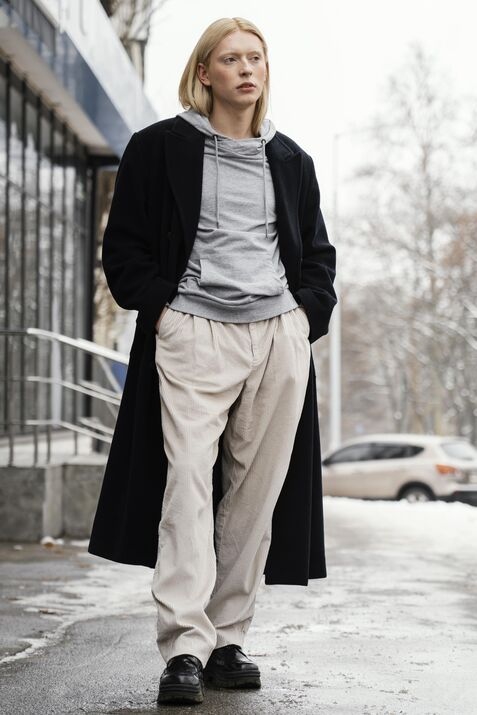 - ignore the balance: a loose tweed jacket with wide bone pants can look heavy. Instead, the balance was equipped with liquid pieces.