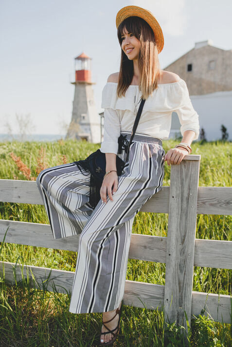 For vacation or summer day go for wide leg or cropped striped linen pant with flowy top and sandal. If you are dressed up for evening dinner wear high waisted striped linen pants with silk blouse and statement jewelry.