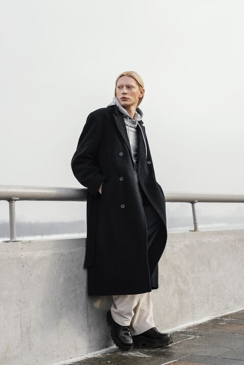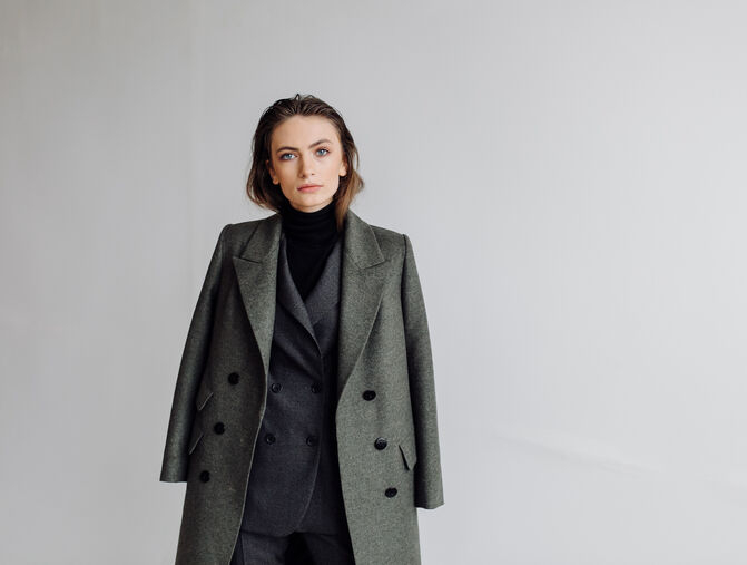 Start with turtleneck sweater and knit top underneath your jacket. Pair it with high waisted wool trouser dark jean pants for polished and comfortable outfit. Add a wool scarf leather gloves and ankle or knee high boot to stay warm while looking chic.
